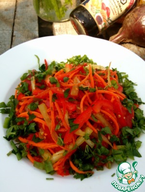 Заправляем салат, добавляем все специи. Перед подачей посыпаем мелко рубленной зеленью петрушки и лука.