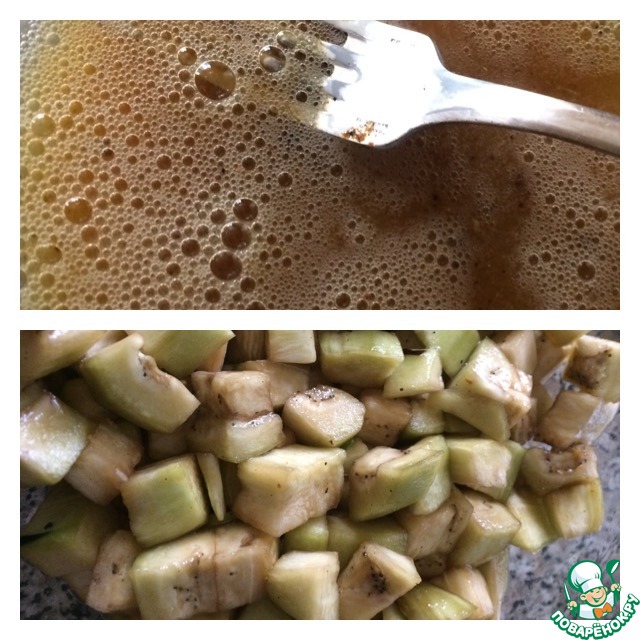 Баклажаны почистить, нарезать кубиком. Яйца взбить с соевым соусом. Нарезанные баклажаны залить яичной смесью, добавить карри, хорошо перемешать и дать постоять минут 30.
