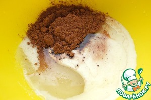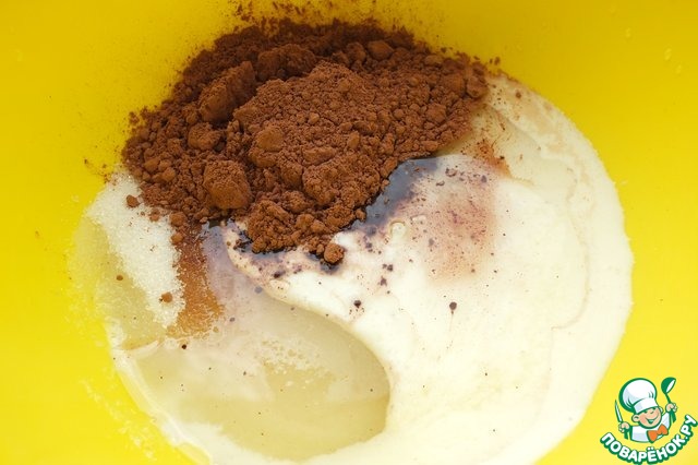 • В кефир добавляем растительное масло, сахар, ванильный сахар, какао-порошок. Перемешиваем.