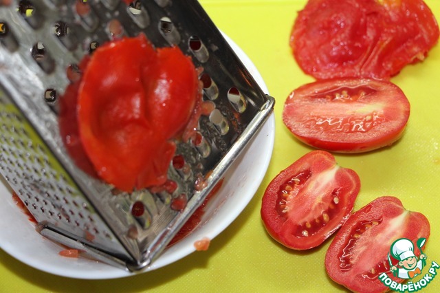 Помидоры разрезать пополам. Натереть на терке, шкурку выбросить.
