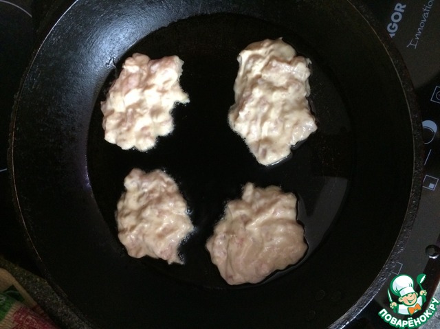 Разогреваем сковороду, наливаем масло и выкладываем наши оладушки. Я выкладываю столовой ложкой, стараюсь делать потоньше чтобы хорошо прожарились!