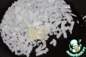 Разогреть в сковороде 1 ст. л. растительного масла, добавить рубленый репчатый лук и измельченный чеснок. Готовить 1 минуту.