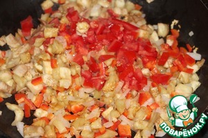 Выложить к луку мякоть баклажан. Добавить болгарский перец, порезанный кубиками, помидор, порезанный аналогично.