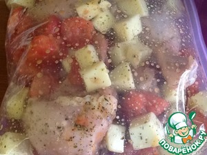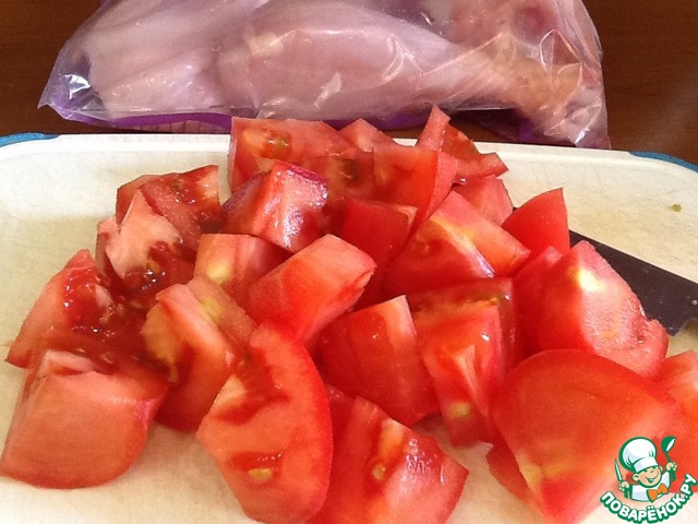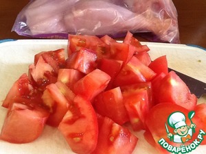 А часть курицы у нас будет по-итальянски. Опять же помещаем запчасти куры в зип-пакет. Туда же режем пару помидорок.