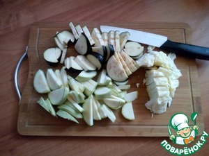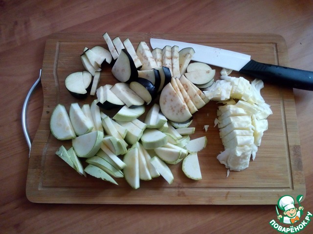 Капусту шинкуем, кабачок и баклажан режем произвольно.