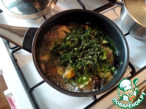 Когда воды останется совсем мало, выкладываем укроп и зелёный лук.