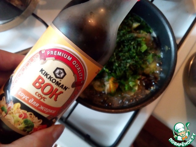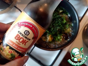 В сотейнике всё перемешиваем и наливаем соевый соус и лимонный сок. Опять всё перемешиваем и доделываем ещё пару минут.