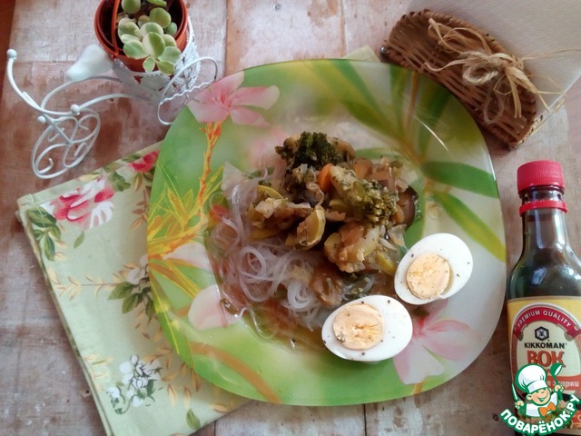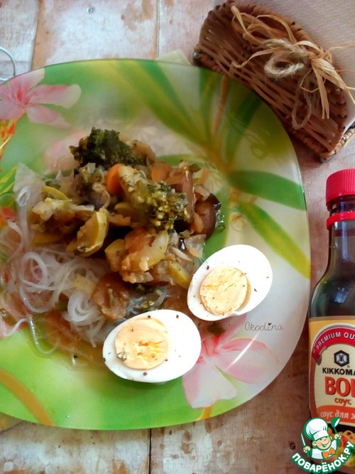 Подала с фунчозой и крутым яйцом. По желанию поперчите по вкусу.