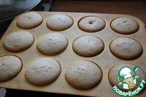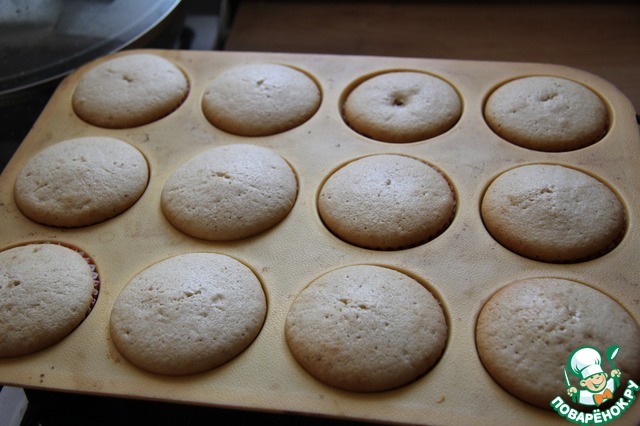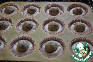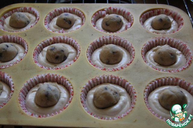 • Духовку разогреть до 180 градусов. Формы для кексов заполнить бумажными капсулами и наливать тесто для кексов на 1/2 объема. Выложить шарик печенья.