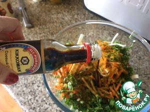 • Всё смешать в ёмкости, добавить карри, чеснок, соевый соус "Киккоман", выдавить чеснок и дать салату минут 15-20 настояться. Затем заправить салат по вкусу маслом, или сметаной.