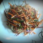 • Все овощи натереть на тёрке для корейской моркови, зелень измельчить.