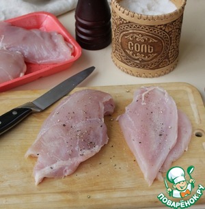 Филе куриной грудки вымыть, обсушить, приправить солью и свежемолотым черным перцем.