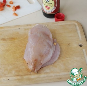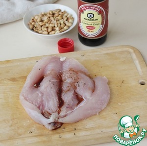 Взять куриную грудку, раскрыть, полить соевым соусом Kikkoman