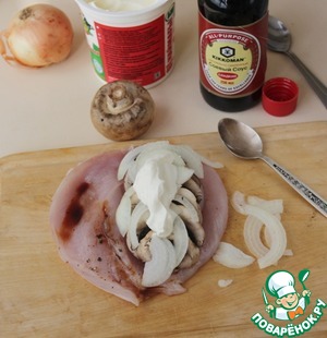 Куриное филе полить соевым соусом Kikkoman, на половину филе выложить рядком грибы, сверху нарезанный лук.