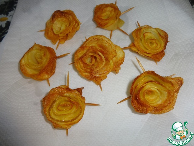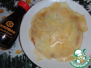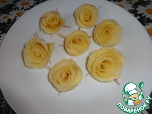 «Лепестки» будущей «розы» толщиной 1-1,5 мм нарезать из сырого картофеля на специальной терке для овощей. "Лепестки" должны получиться тонкие и полупрозрачные. Поливаем соевым соусом.