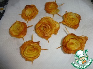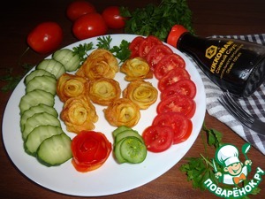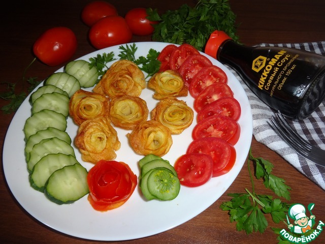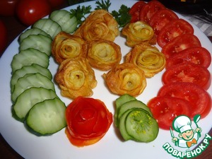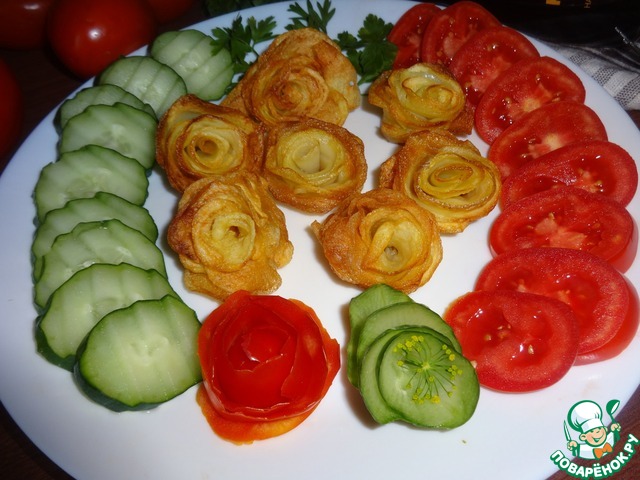 Такие оригинальные розочки приготовленные из картофеля и украшенные овощами, можно подавать как гарнир к любому мясу, а можно и как самостоятельное блюдо.
