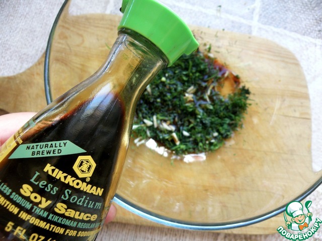 Мелко нашинковать укроп, мяту и чеснок. Полить соевым соусом – лучше всего легким от «Киккоман» - добавить мед и лимонный сок. Хорошо перемешать.