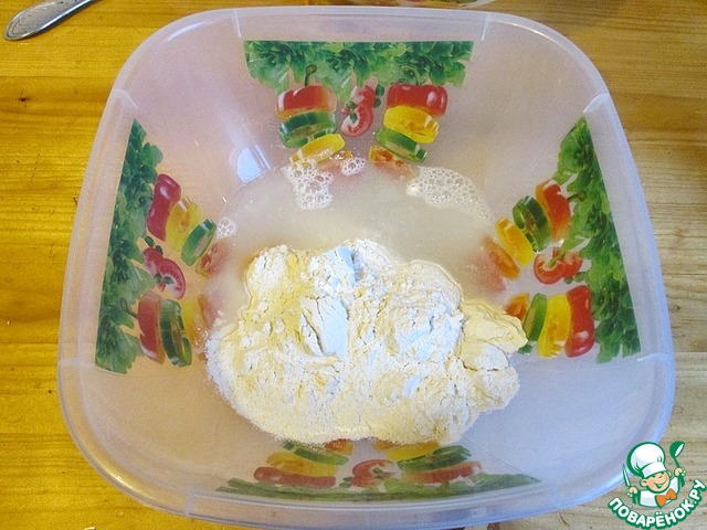 Не торопясь вымешиваем, добавляя воду, что б тесто было вот такое жидкое, видите как стекает с венчика?