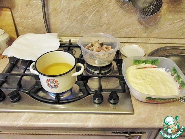 Методика такая, берем вилку, накалываем кусок селедки, макаем в кляр, и с помощью второй вилки стряхиваем во фритюр, аккуратно, там у нас 170 градусов!
