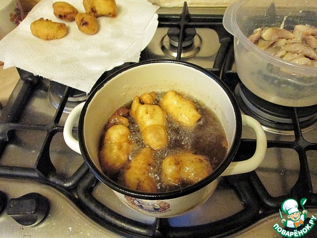 Ну и понеслась, готовые вылавливаем на салфетку, что б лишнее масло впитало, новую партию загружаем. Готовность по цвету определяем.