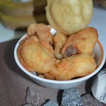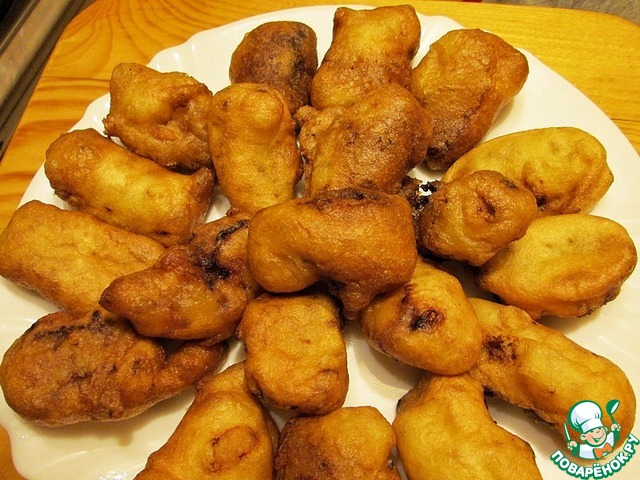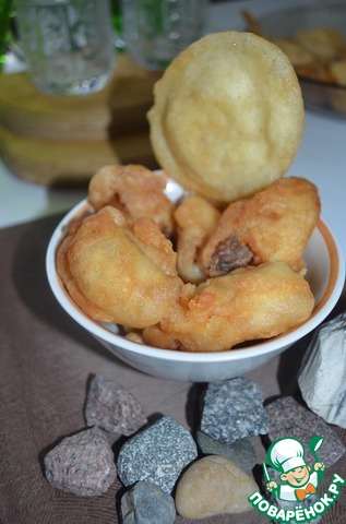 Когда фритюр готов приступаем к финальному смешиванию кляра, а именно аккуратно ложкой перекладываем взбитые белки в тесто и опять таки очень аккуратно ложкой вмешиваем в тесто, ложкой! Никакого венчика или, упаси бог, миксера. Воздушность убьете. К стати кляр живет не долго, я про воздушность, поэтому его перед самой жаркой соединяем. Если белки чуток подсели снизу, пока фритюр грели, то взбодрите их миксером.