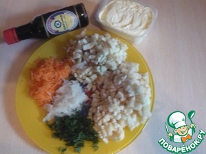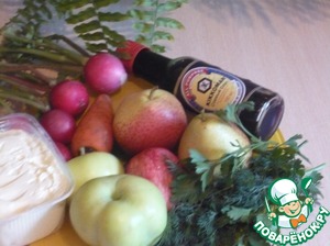 Кубиком режем яблоки и грушу и натираем на терке редис и морковь. Смешиваем ингредиенты, добавляем соевый соус и сметану.