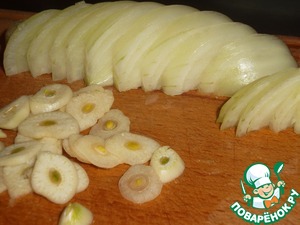 Лук порежем тонкими полукольцами, чеснок – колечками… -