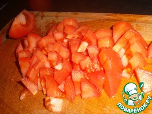 Помидоры ошкурим (с помощью кипятка) и нарежем средними кубиками…
