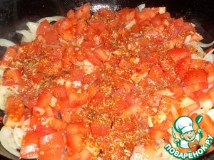 Помидоры отправляем к луку, посыпаем приправами, обжариваем минут 5…