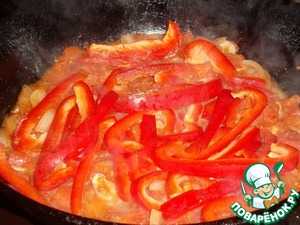Сверху выкладываем болгарский перец, перемешиваем и обжариваем мину 8…9…