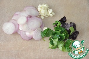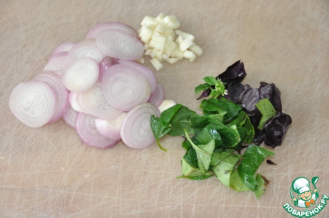 Режем тонкими кольцами лук ( у меня мелкий, красный), мелко рубим чеснок, зелень мяты и базилика.