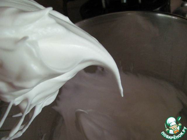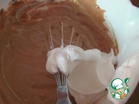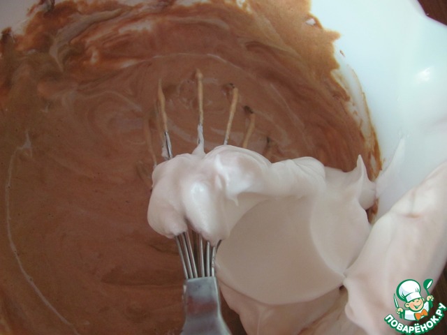 В три-четыре приема добавляем к желтковой массе белки. Первую порцию вмешиваем не особо жалея белки. Остальные порции вводим аккуратно. Перемешиваем методом складывания. |