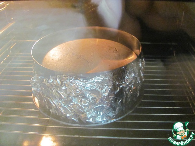 Дно формы застилаем бумагой для выпечки. У меня кольцо диаметром 18 сантиметров, которое я затянула фольгой. Выливаем тесто. Разравниваем. |