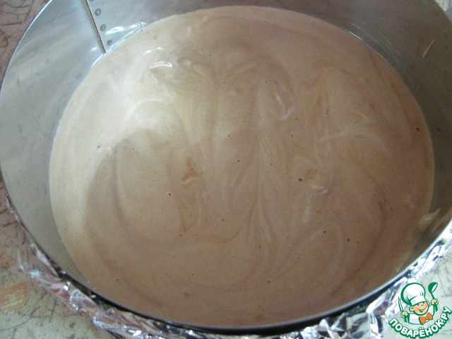 Дно формы застилаем бумагой для выпечки. У меня кольцо диаметром 18 сантиметров, которое я затянула фольгой. Выливаем тесто. Разравниваем.