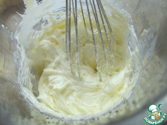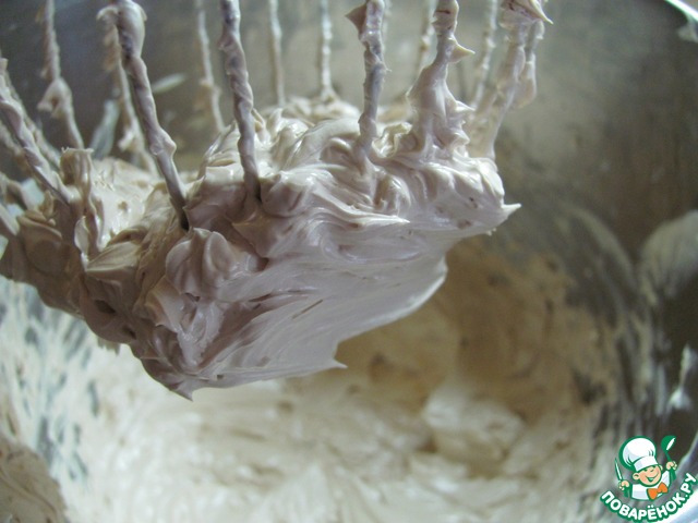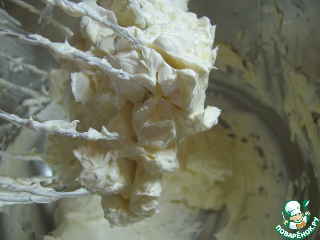 Во взбитые белки очень маленькими порциями (примерно чайная ложка) добавляем масло и взбиваем до полного смешивания белка с маслом. Масса вначале будет, как жидкая сметана, но потом соберется. И превратится в плотный крем.