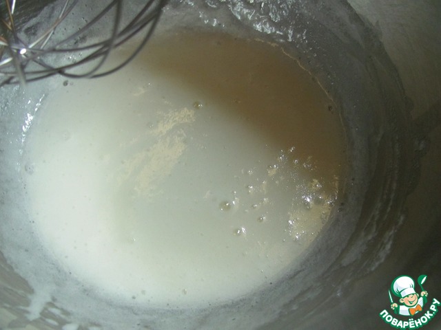 Постоянно размешивая белки, довести их до температуры 60-65 градусов. Сахар должен полностью раствориться. Перелить в дежу и начать взбивать.