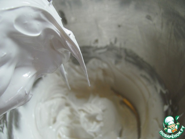 Белки взбить до пиков. Начинаем взбивать на небольшой скорости. Как только белки поменяют цвет в 5-6 приемов добавляем сахар. Каждую следующую порцию добавляем через 10-15 секунд после предыдущей. Скорость миксера увеличена до средней. Когда всыпали весь сахар добавляем обороты миксера и взбиваем до нужной консистенции.