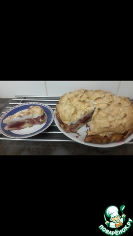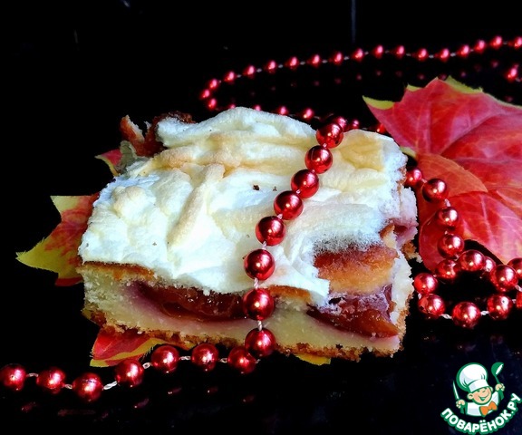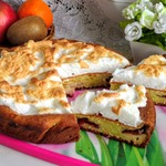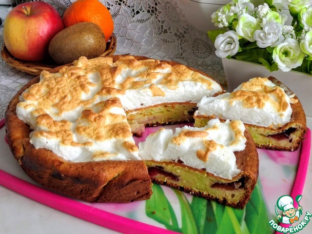 Деревянной шпажкой проверяем пирог на готовность, вынимаем, верх пирога покрываем взбитыми белками и снова отправляем в духовку на 10-12 минут, пока белок не станет золотистого цвета.
