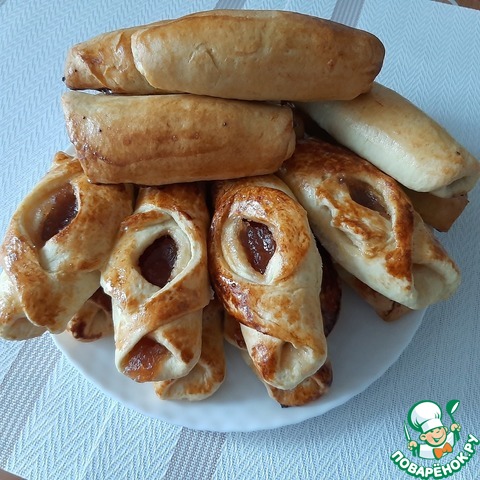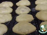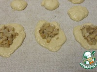 Для этого мы должны тесто разделить на небольшие шарики, потом раскатать и выложить на середину начинку. Защипнуть края.