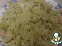 для приготовления этой начинки я использую свежую капусту. Её нужно нашинковать и обжарить на растительном масле. Взбить яйца и вылить в сковороду к капусте и всё хорошо перемешать, добавить соль и специи по вкусу.