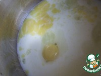 Следующий этап - приготовление теста: в глубокую ёмкость мы наливаем подогретое молоко, добавляем сахар, разбиваем яйца и всё хорошо перемешиваем.