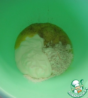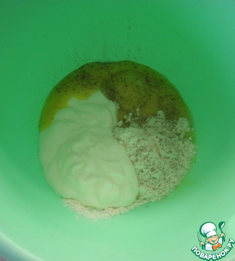 Соединить желтки, сметану, муку, соль и перец по вкусу, хорошо взбить миксером. -