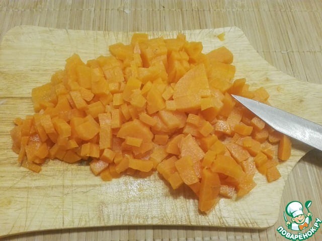 Морковь моем и отвариваем до полу-готовности в течение 20 минут. Охлаждаем, чистим и нарезаем кубиками.