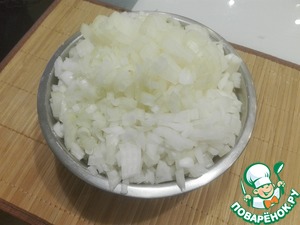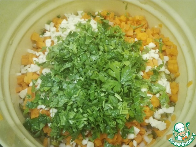 Очищаем болгарский перец от семенной коробочки и бланшируем в течение 2-3 минут. Охлаждаем и режем на кубики.