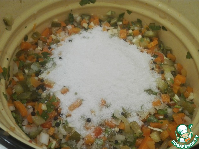 Складываем подготовленные продукты в кастрюлю и добавляем соль.