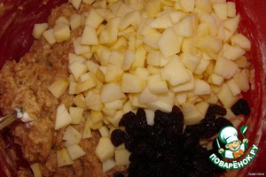 Большую часть времени занимает нарезка яблок. Можно и пюре использовать, но мне нравится, чтобы яблоки были кусочками. А в остальном все просто: смешать сахар, муку, яйца, масло, разрыхлитель, соль, кефир и 1 ч. л корицы. Добавить изюм и яблоки