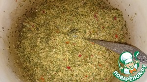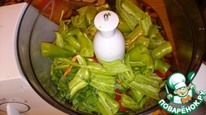 Перекручиваем зелень и чеснок, добавляем в кастрюлю к перцу.