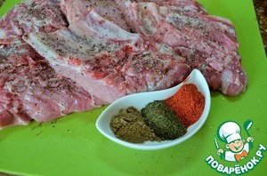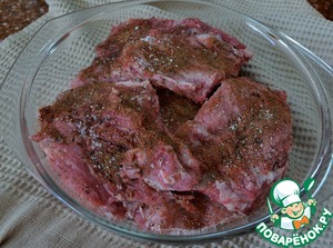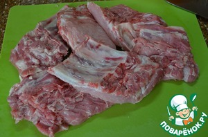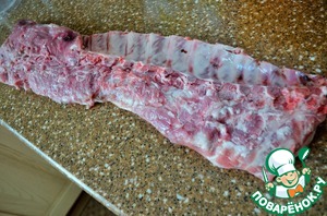 Мясо вымыть, обсушить и нарезать на куски по 2-3 ребра.