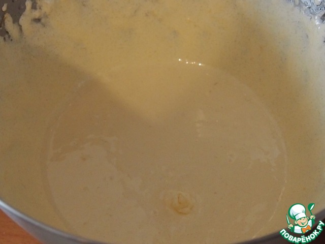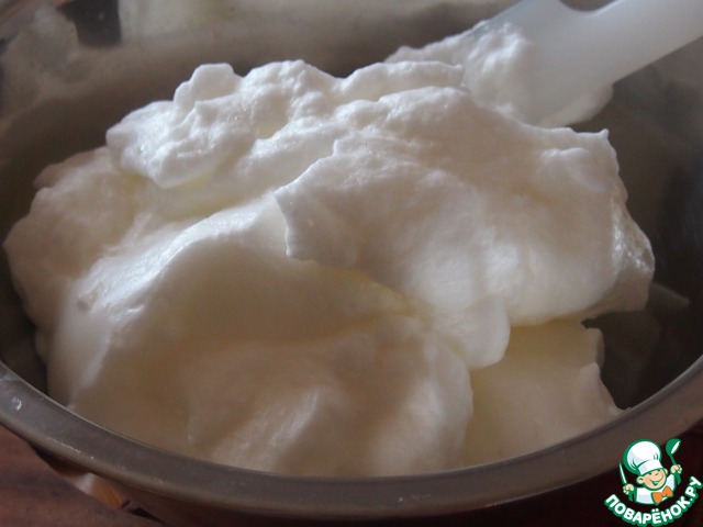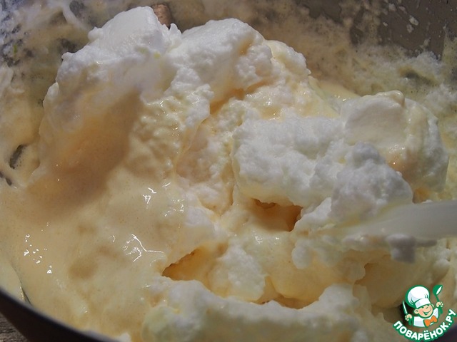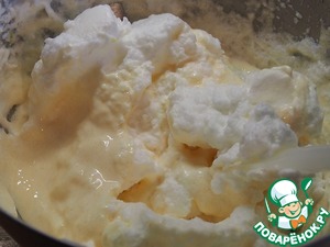 В желтковую массу добавить взбитые белки. Слегка перемешать.