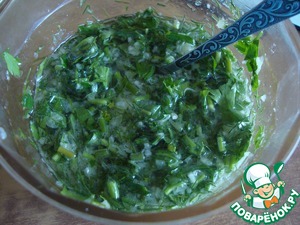 В эту массу добавить мелко нарезанную зелень, перемешать.
